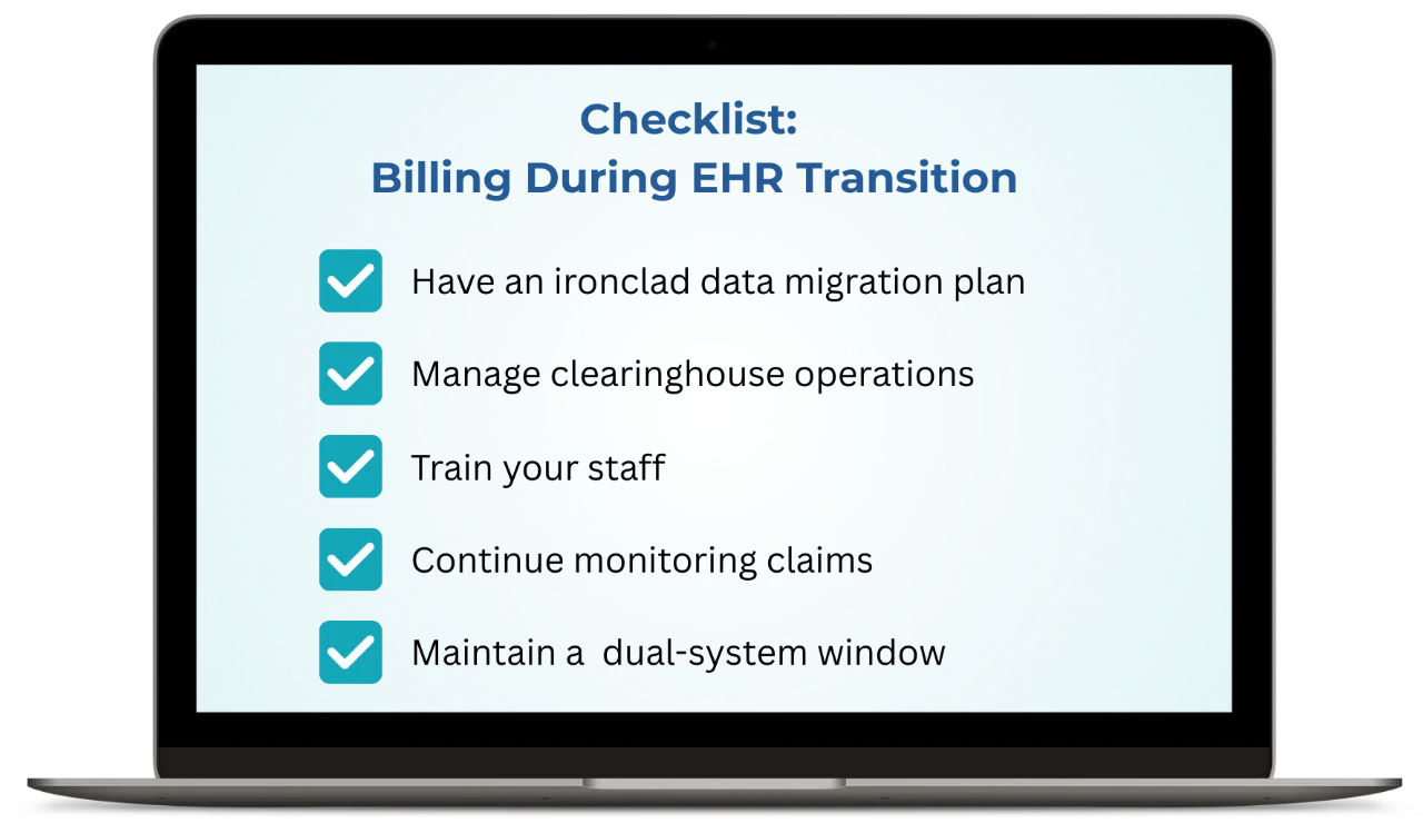 Collaborate with a specialty-specific EHR vendor to create a comprehensive data migration strategy. Before going live, validate all transferred billing records. Submit test claims and audit migrated data to spot discrepancies early. When you start using the new system, use a small group of live claims initially, and then launch the full rollout to minimize financial risk.